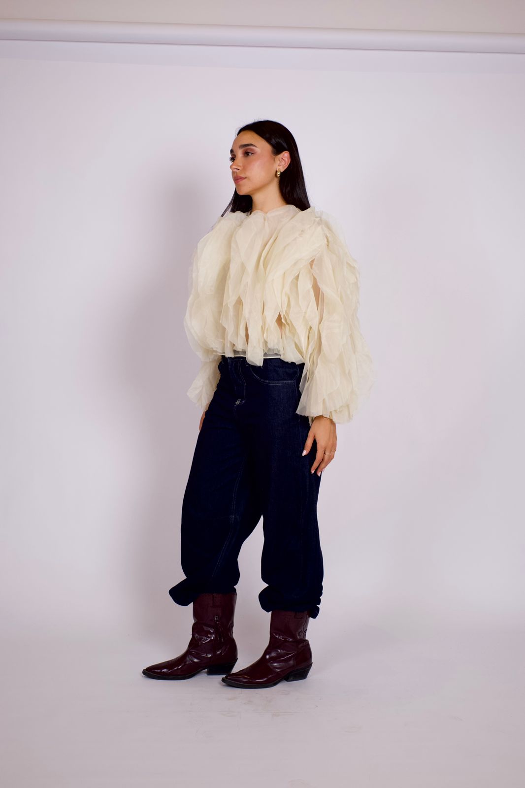 The Classy Blouse is made from light chiffon, offering a smooth, airy feel with a refined finish. Its clean lines and elegant texture make it a timeless piece for effortless sophistication.