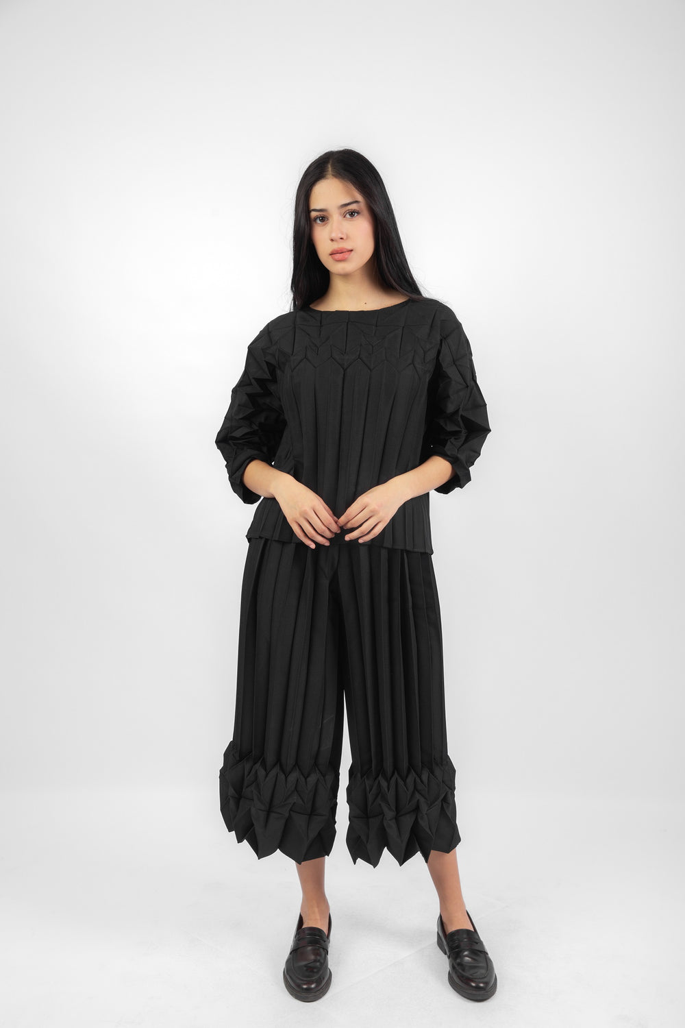 The Crunchy Set — is crafted from soft crepe with satin pleats for a modern, textured look. Its structured top and cropped pants blend comfort with effortless elegance.
