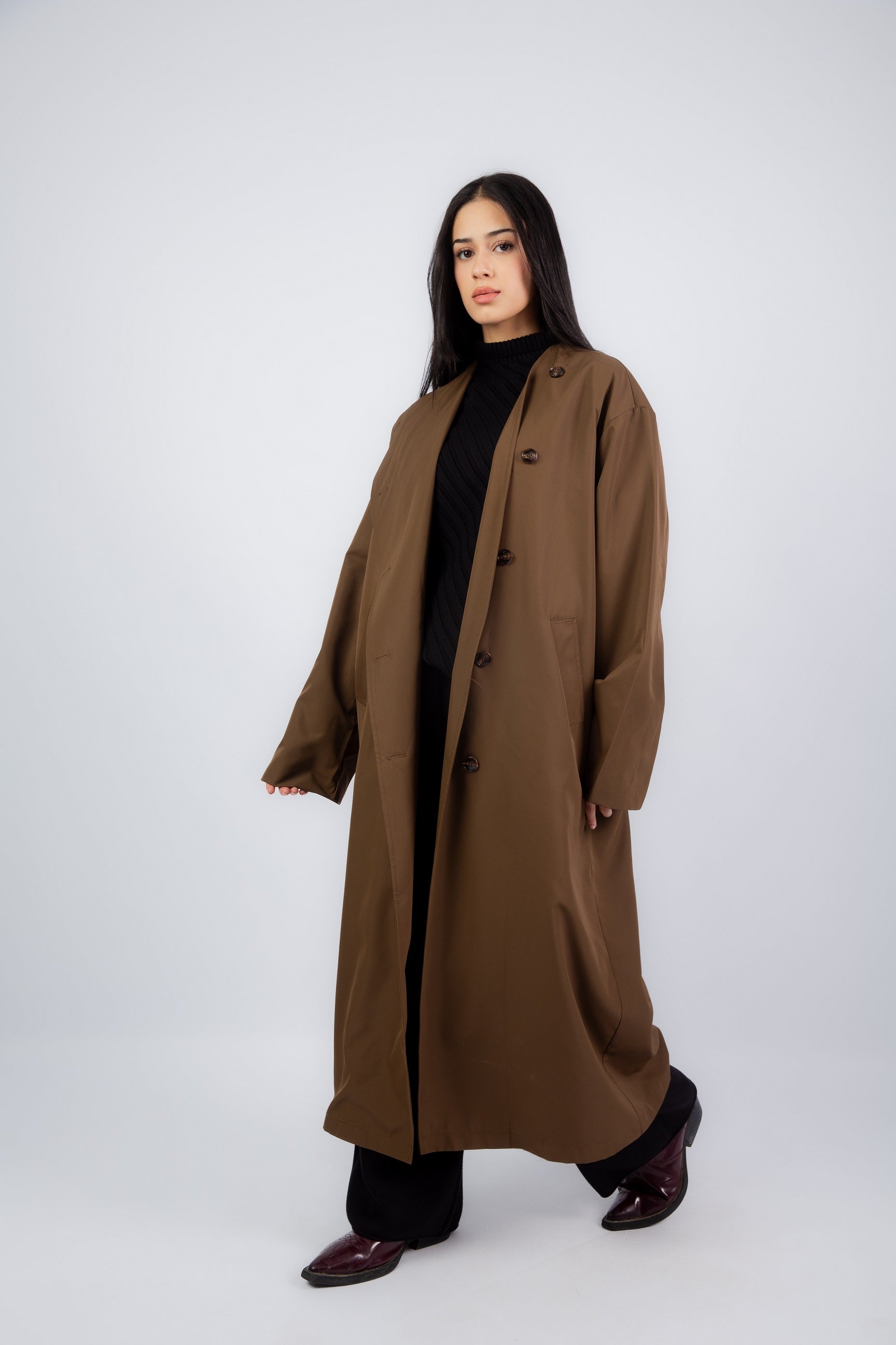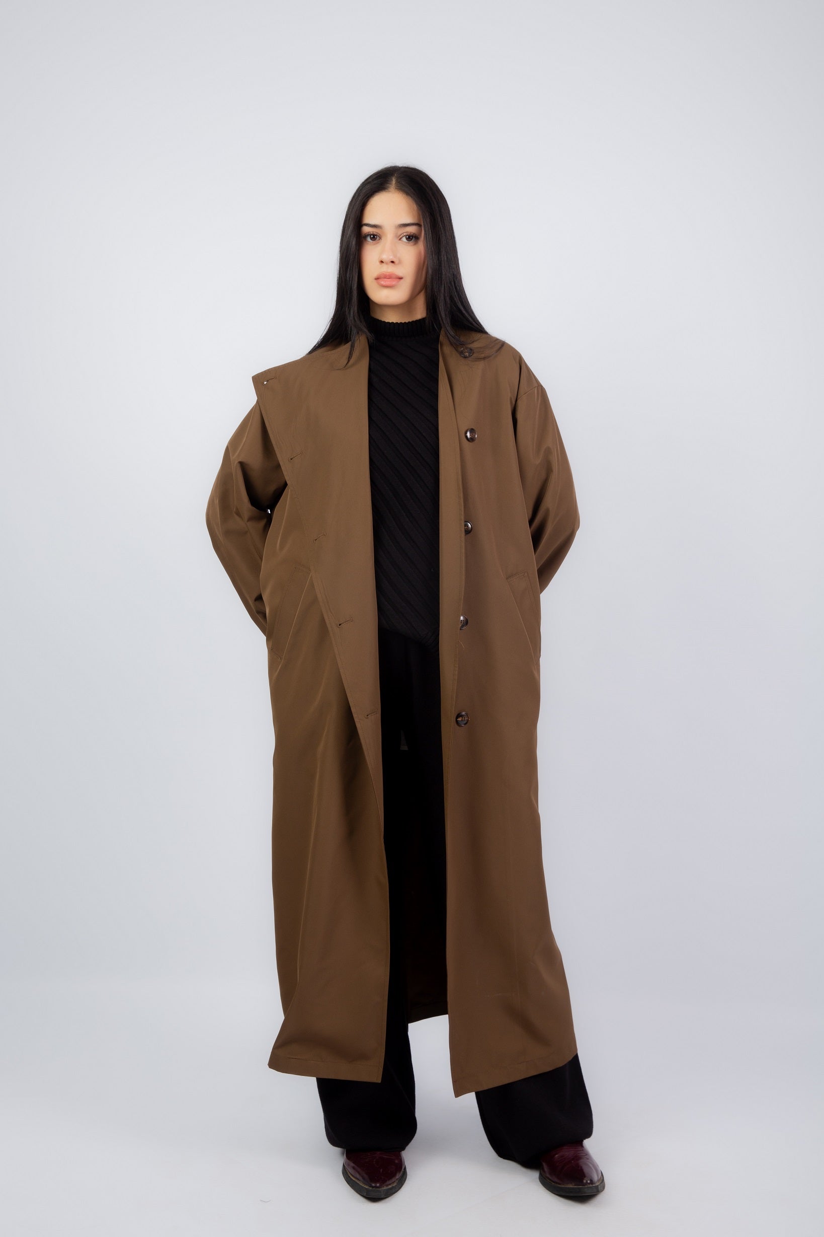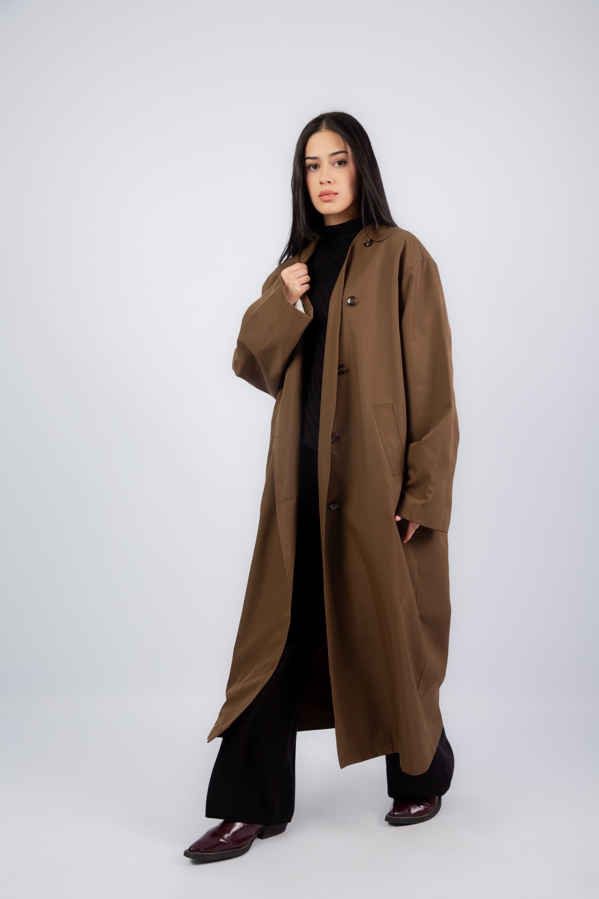 The Flow Coat – A sleek, waterproof layer designed to keep you dry and stylish. With its relaxed silhouette and fluid drape, this coat blends function and elegance, making it a must-have for rainy days and beyond.
