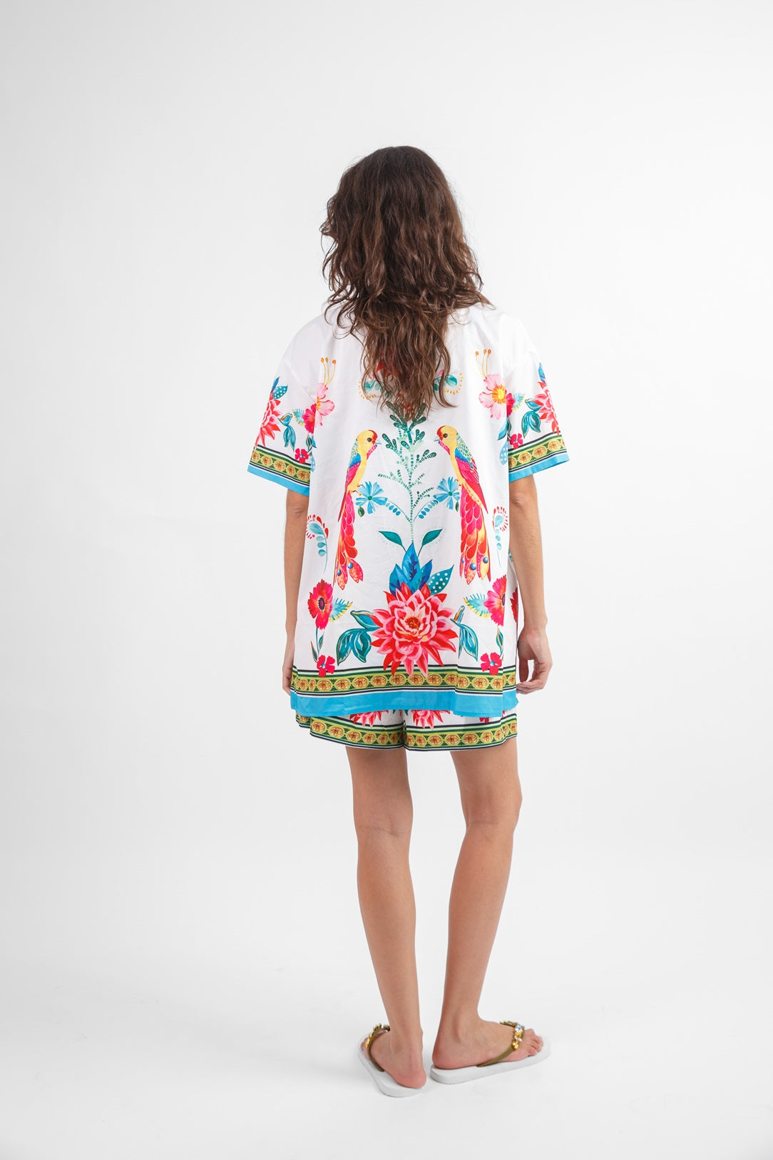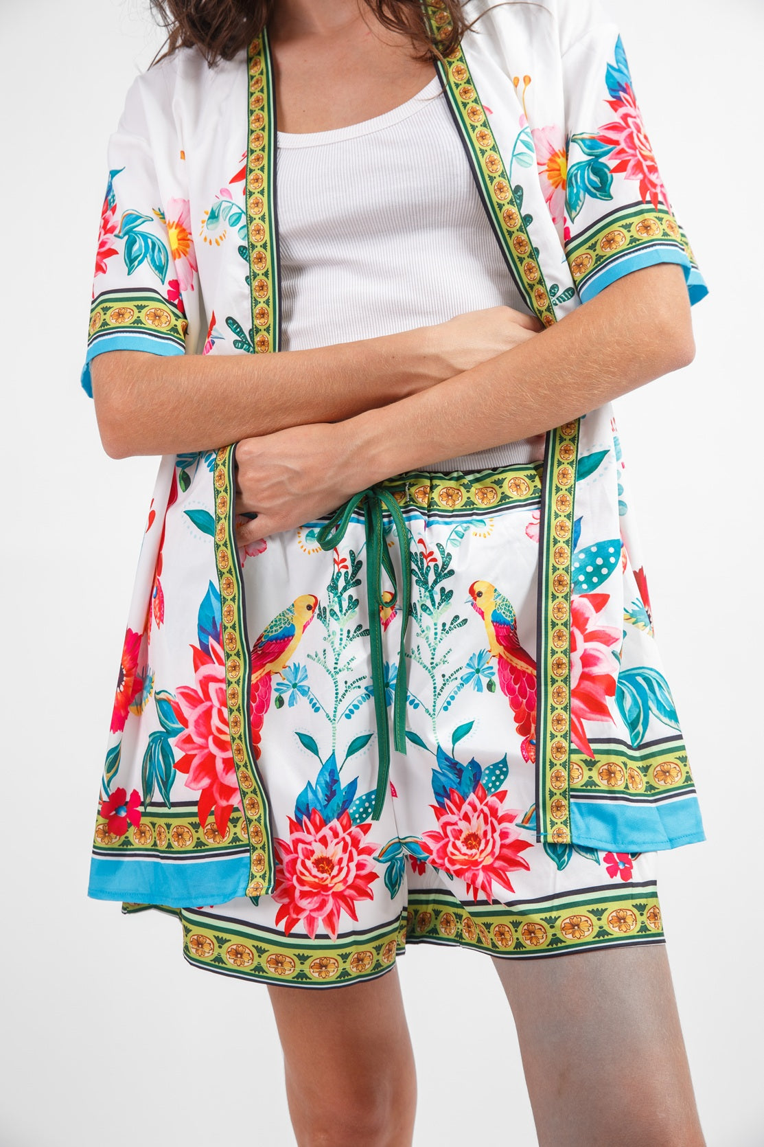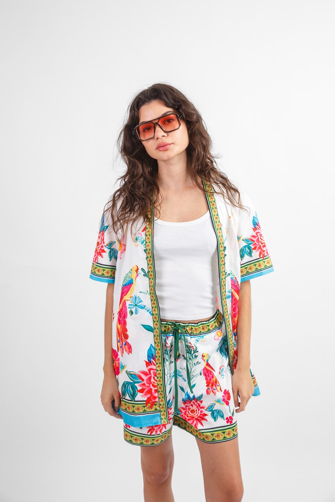 The Parrot Set is crafted from smooth satin, offering a glossy finish and a lightweight feel. Featuring vibrant, tropical-inspired prints, this set brings bold color and effortless elegance to your look—perfect for summer days.
