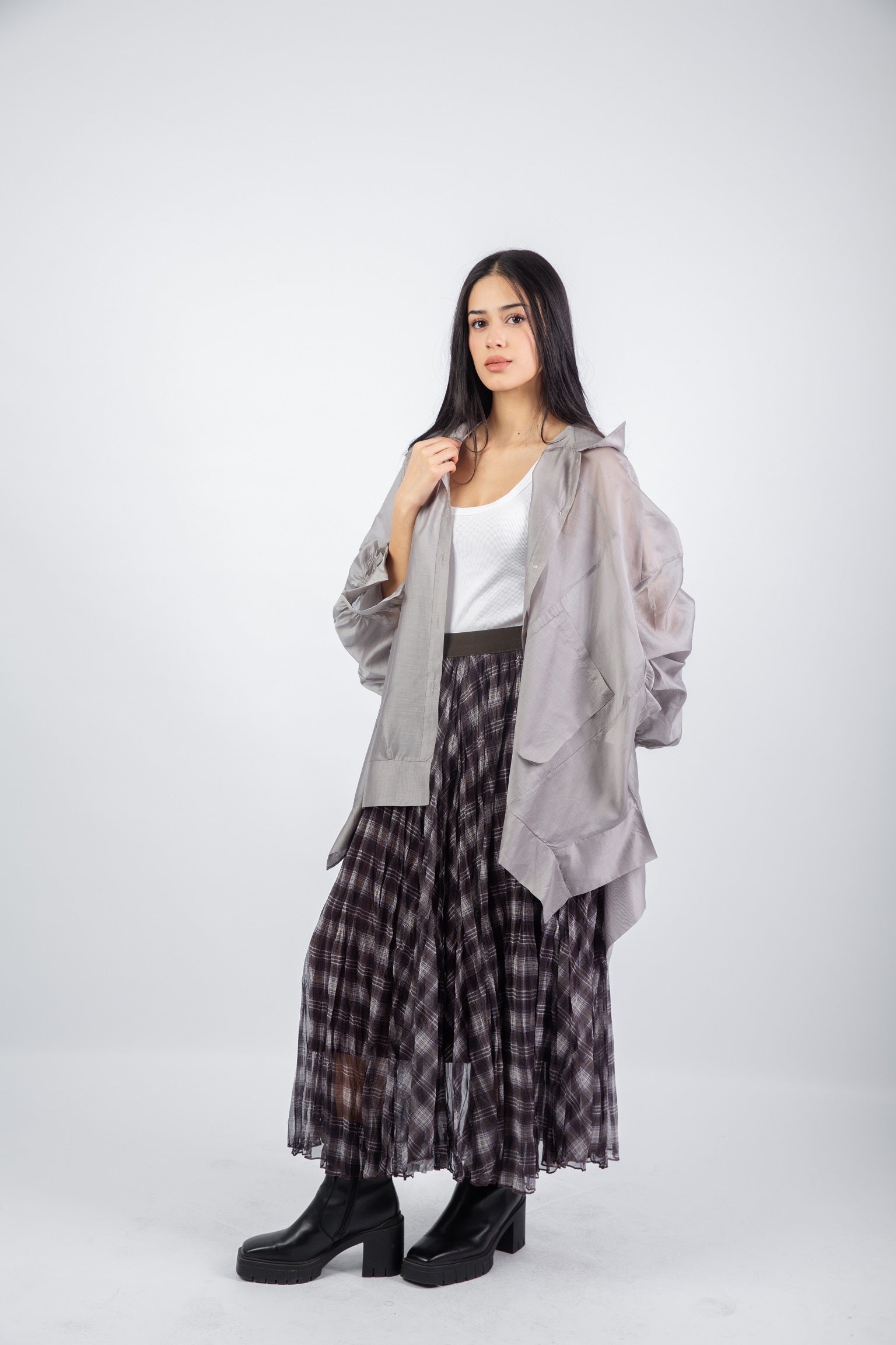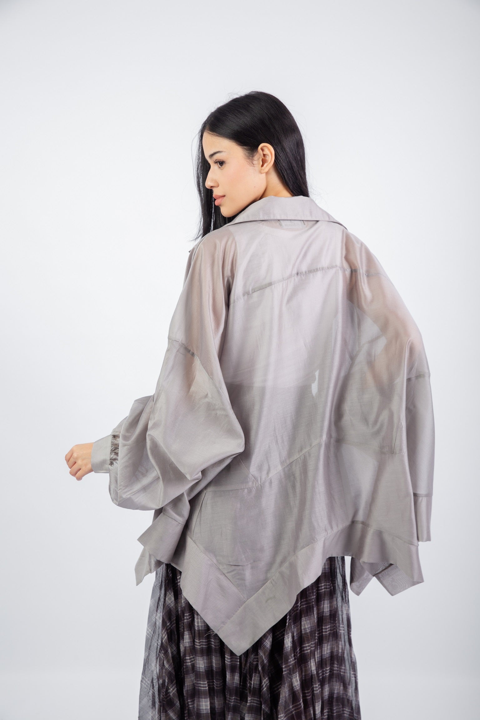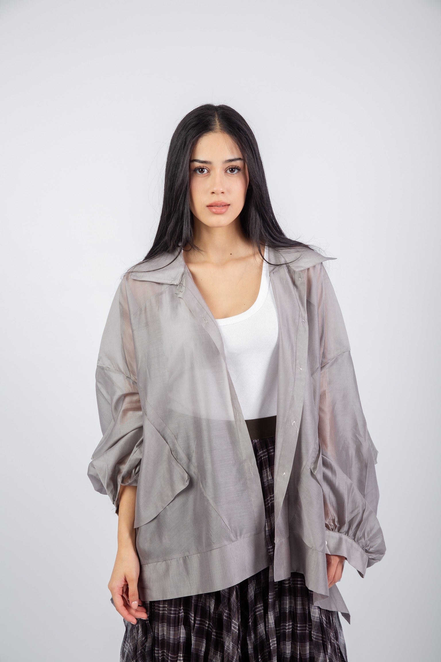 The Sheer Shirt – Crafted from lightweight organza, this piece adds an effortless layer of elegance to any look. Its airy, translucent finish and fluid silhouette make it perfect for refined styling and versatile layering.