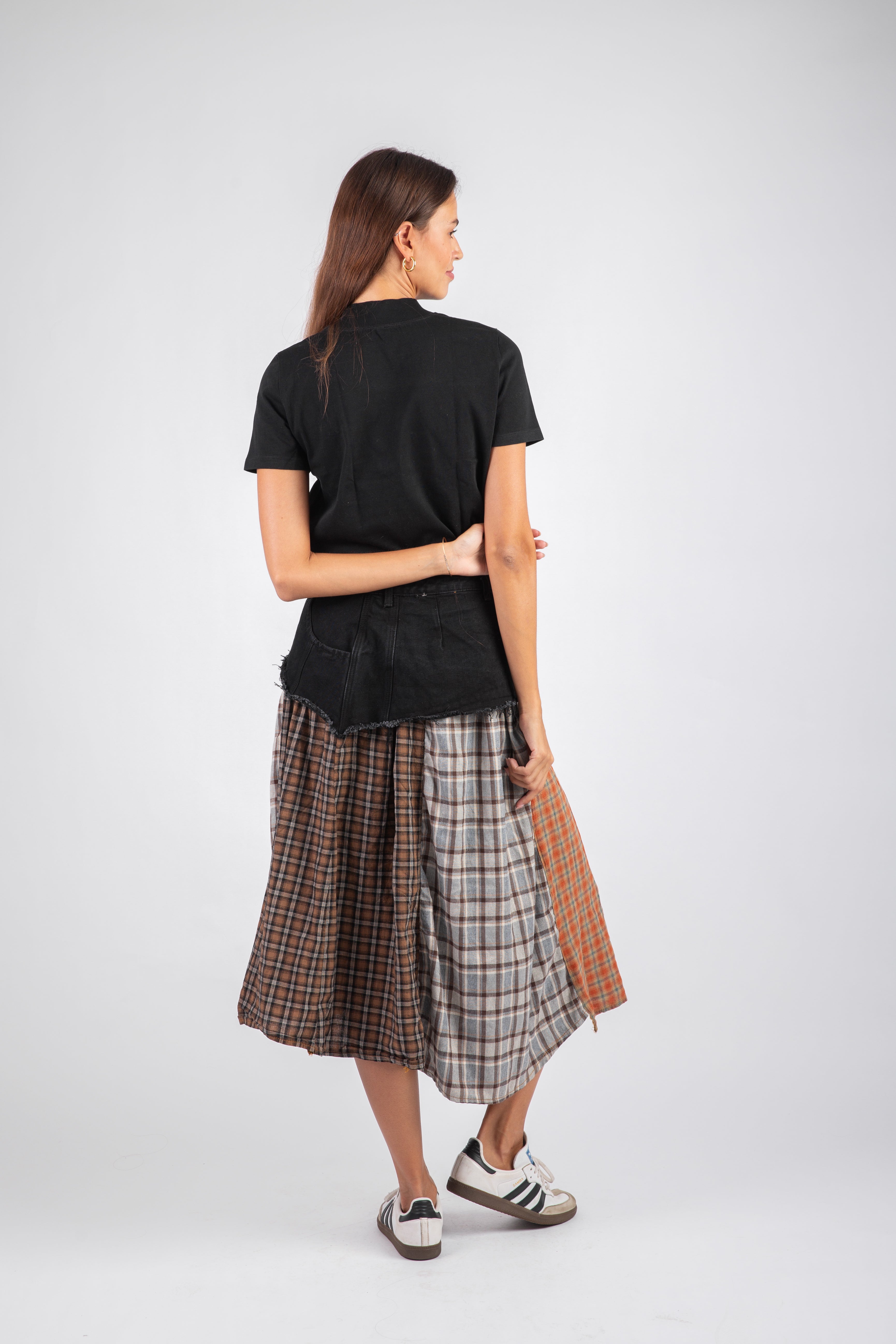 The Squares Black Skirt is made from a mix of denim and cotton, offering a balanced blend of structure and ease. Its square-cut detailing adds a sharp, contemporary edge to this classic black staple.