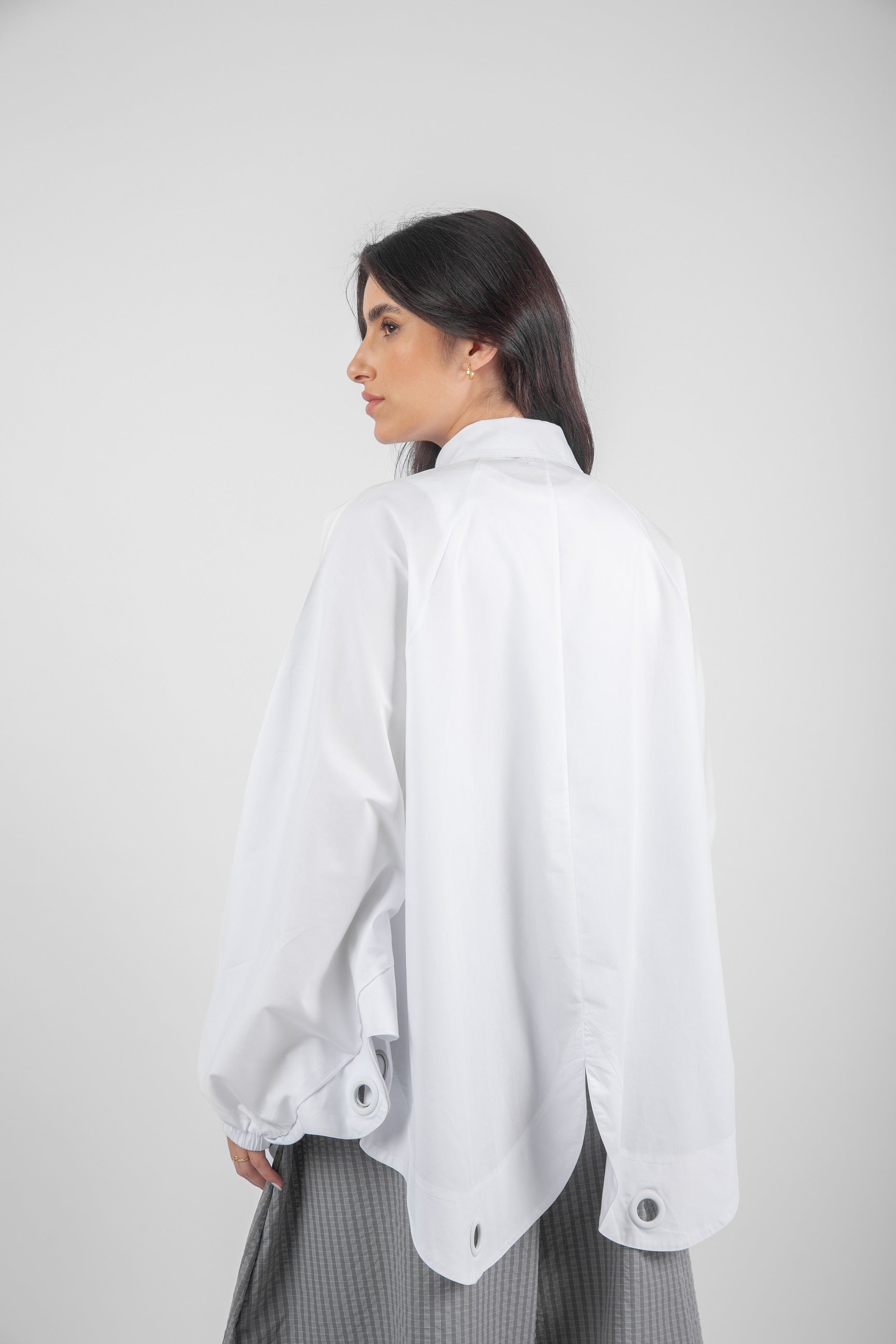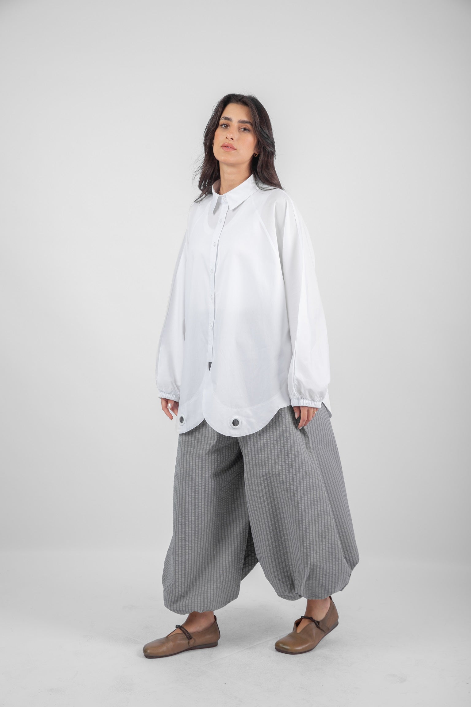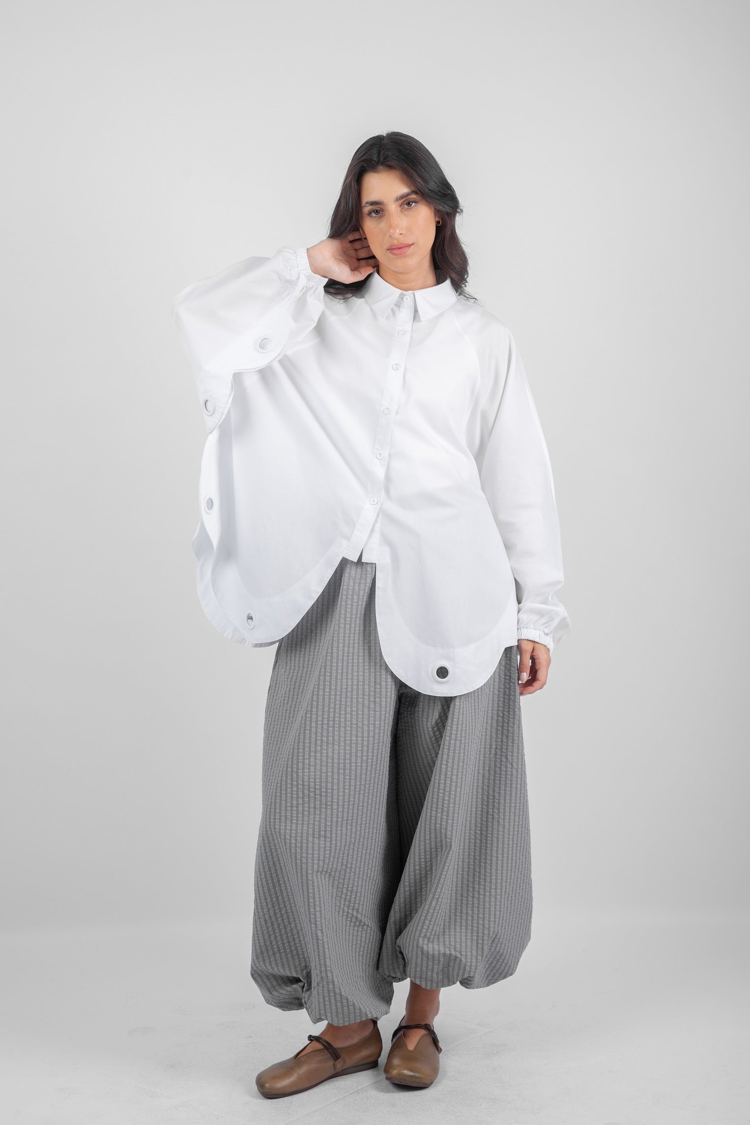 The Arc Shirt – Crafted from pure cotton, this shirt features a sculpted, curved silhouette with an effortless oversized fit. Its clean lines and soft structure make it a versatile staple for both casual and elevated looks.