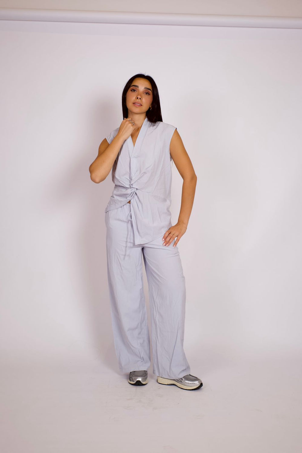 The Tie Set is crafted from lightweight linen, featuring a relaxed silhouette with playful tie details. Its breezy texture and effortless style make it a go-to choice for warm, carefree days.